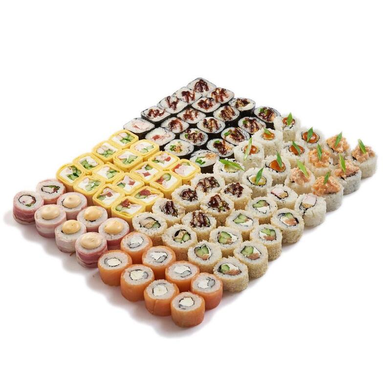 Состав: классика лососем, ролл в беконе, тортилья с копченой курицей, тортилья с креветкой, ролл с угрем и омлетом, ролл с лососем и кунжутом, ролл с крабом и омлетом, ролл с креветкой и сыром, ролл с томатом и беконом, ролл с жареным лососем
