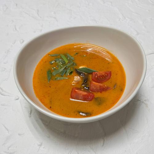 Состав: бульон куриный, молоко кокосовое, паста том ям, петрушка сухая, лук зеленый, перец красный, шампиньоны, филе куриное, помидоры черри, рис отварной